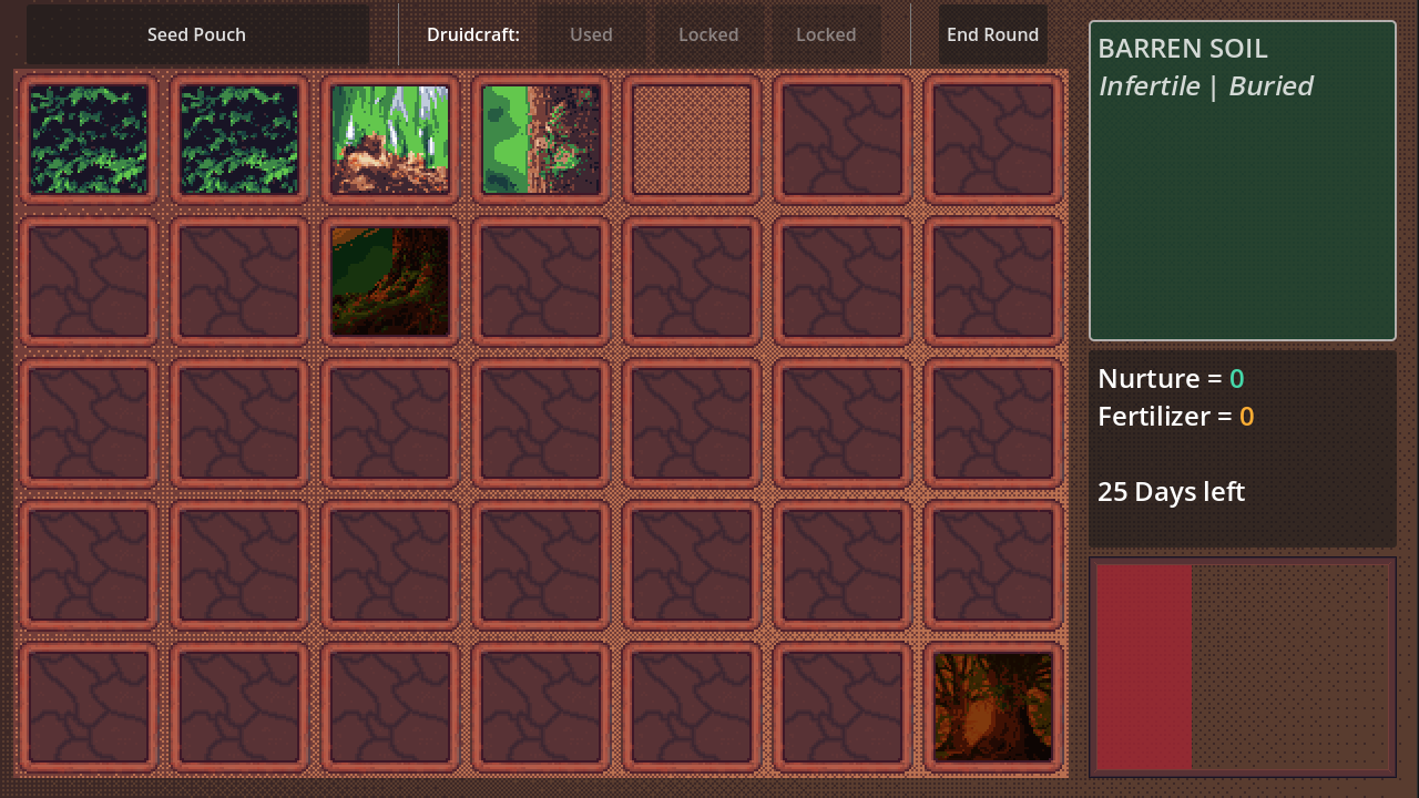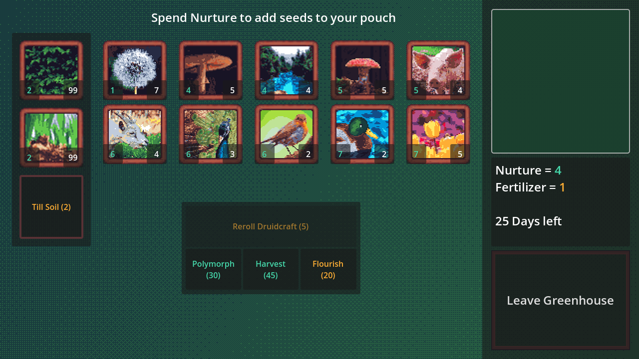A streamlined deck builder—click on the seed pouch to plant a random seed in your Garden. Draft new seeds to your pouch from the Greenhouse to make the best Garden you can and avoid it Rotting away. Win by causing a plot to Bloom before you run out of days.